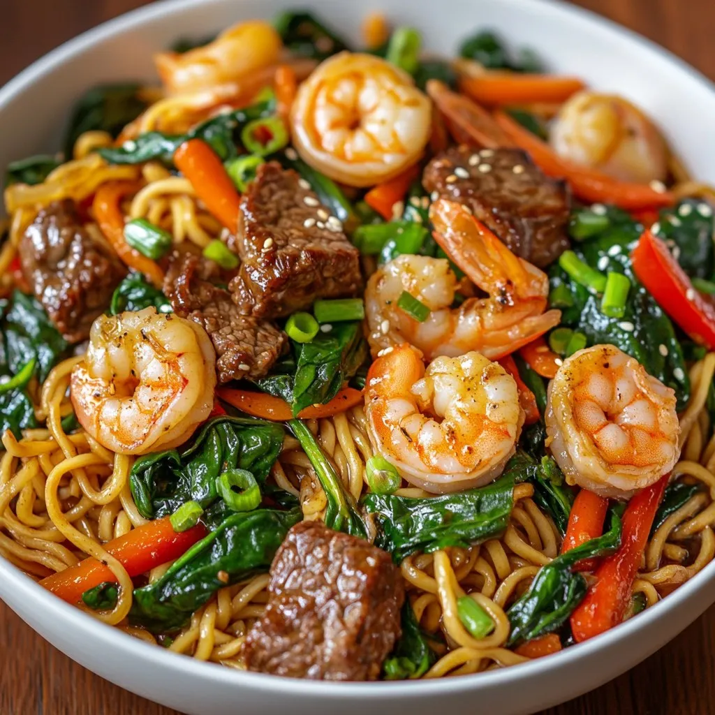 Les nouilles sautées aux crevettes et au bœuf sont un plat emblématique de la cuisine asiatique, alliant la tendreté de la viande, la finesse des crevettes et la texture fondante des nouilles. Ce mélange de saveurs terre et mer, relevé par une sauce parfumée au soja et au gingembre, offre un équilibre parfait entre gourmandise et légèreté. C’est un plat complet, rapide à préparer et idéal pour un dîner savoureux et équilibré.